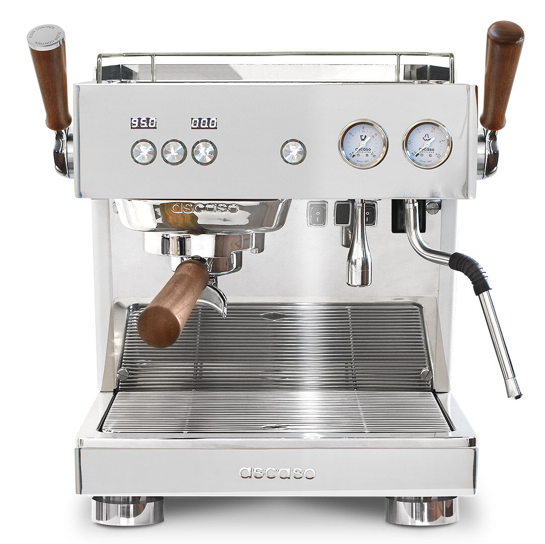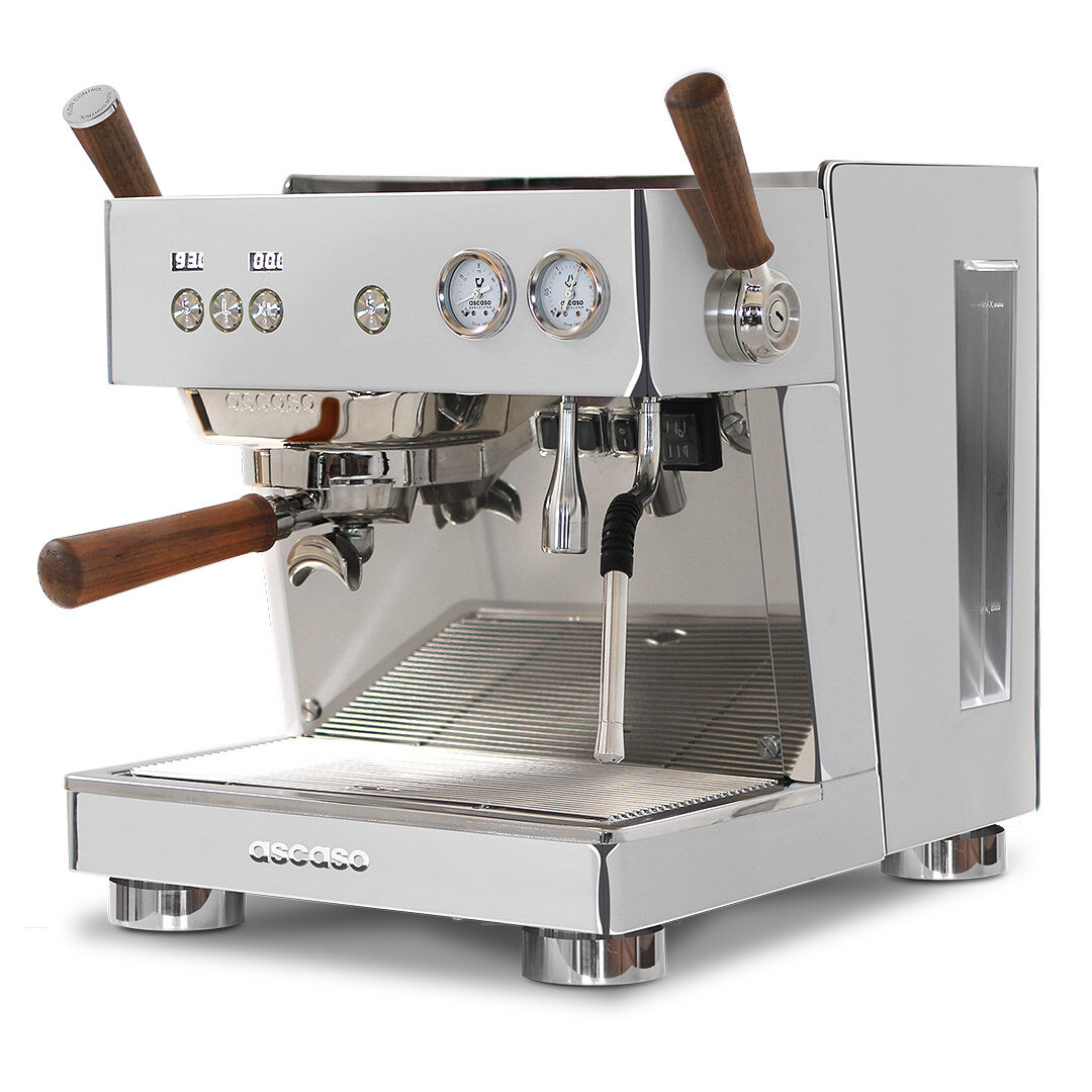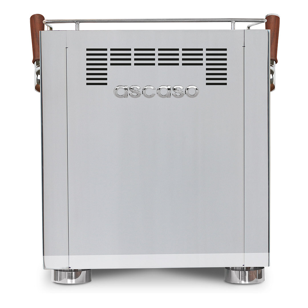 High End Maschine mit Multi-Element Technologie, unabhängigem isolierten 2,5 l Serviceboiler aus Edelstahl, PID Kontrolle, Druckkontrolle im Brühkopf durch Flow Control, Shot- Clock , programmierbaren Portionstasten (volumetrisch), Joystick für den Dampf, vorgeheizter Profi -Thermoblock Brühgruppe, Rotationspumpe, 2 l Wassertank und Festwasseranschluss, separatem Heisswasserauslass, LED Barista- Lights, Tassenwärmer, Holz- Accessoires und der neuen ascaso App- Steuerung.