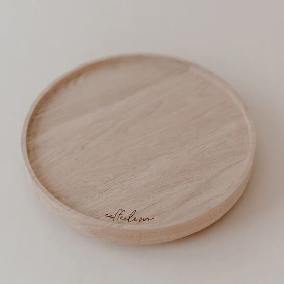 Dieser Drehteller hat auf der Oberseite den handgeschriebenen Schriftzug "Coffeelover" graviert.