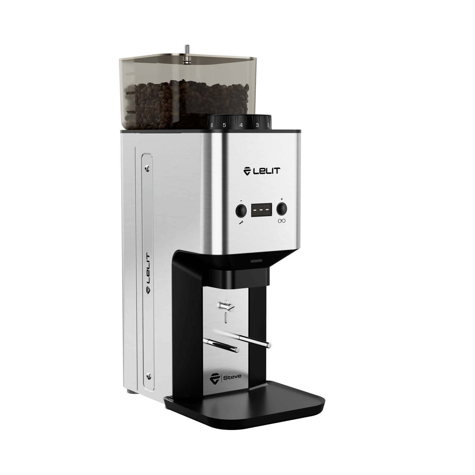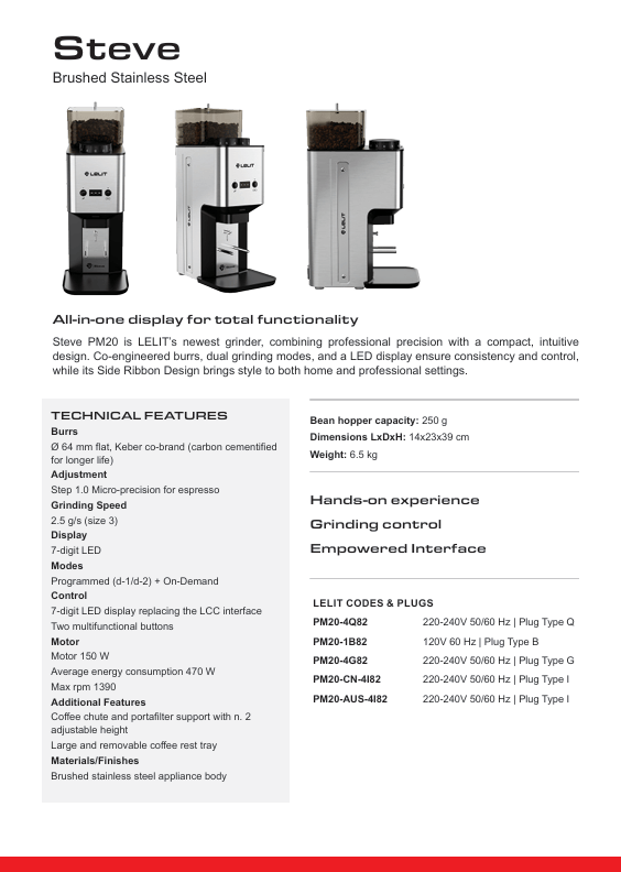 Lelit Steve - hochwertig, perfekt, schnell und schön - die neue PM20 Steve Espressomühle aus Italien mit integriertem Timer, 7-digit LED-Display und grossen Mahlscheiben passend zur Mara oder die Bianca.