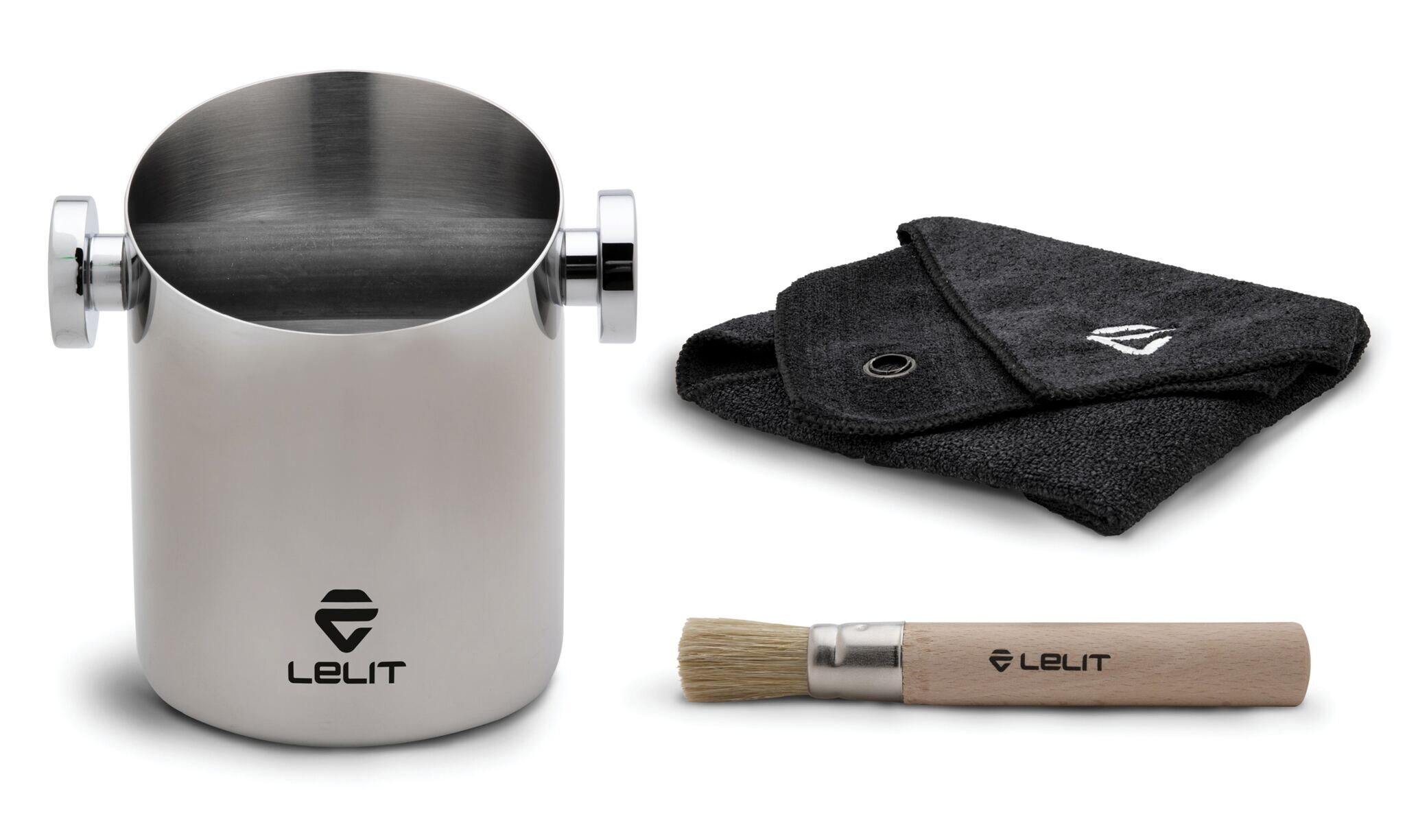 Kit bestehend aus Lelit Zylinderknock-box Ø 10,5 cm, Tuch und Bürste zur perfekten Reinigung des Filters nach jedem Gebrauch.